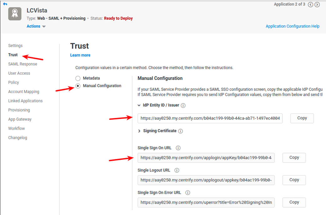 - When finished, click on Trust in the menu. You will use the information in the Identity Provider Configuration Metadata and Manual Configuration areas to configure SAML in LCvista.