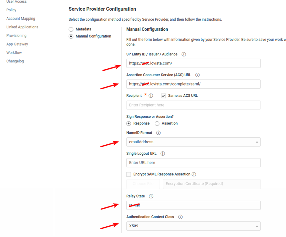 - Assertion Consumer Service (ACS) URL: https://<site prefix>.lcvista.com/complete/saml/
