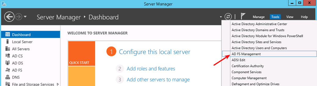 - From the Server Manager Dashboard on your ADFS server, go to Tools and click on AD FS Management.