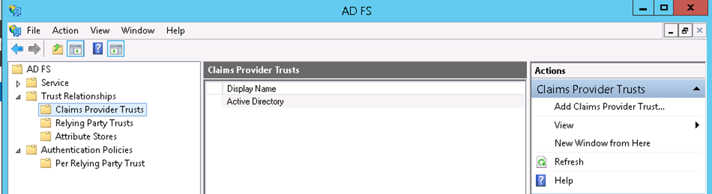 - In the ADFS Management Console, check on the Claims Provider Trusts and make sure AD is in the list: