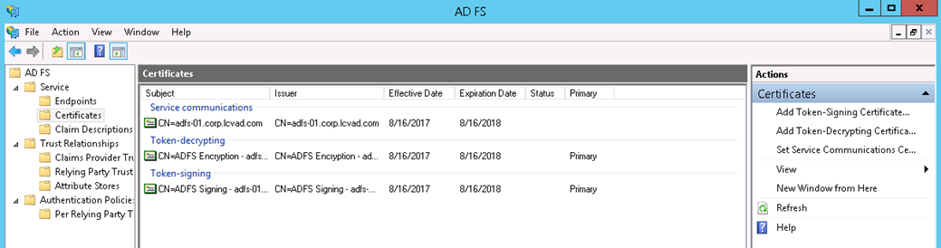 - From the ADFS Management Console, expand Service, then click on Certificates.