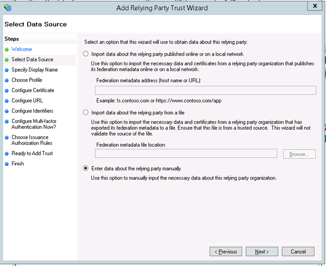 - You will see the Add Relying Party Trust Wizard. Click on Start to begin the wizard configuration and then select Enter data about the relying party manually.