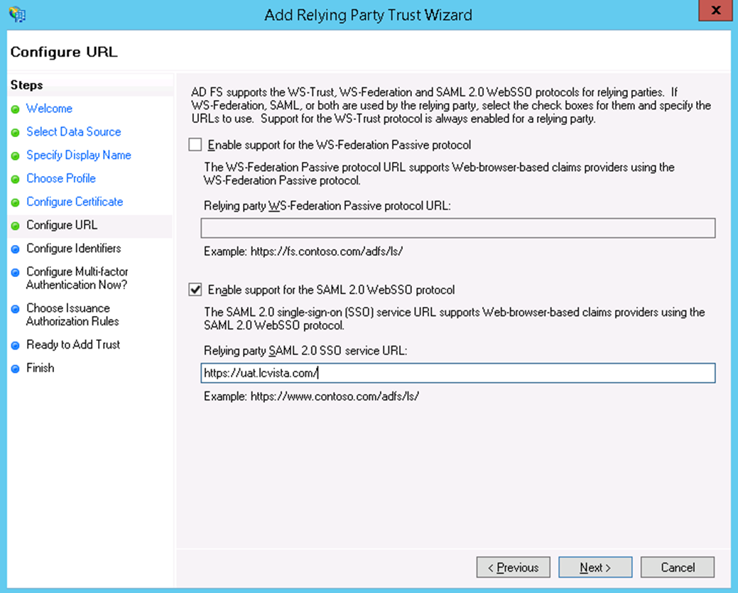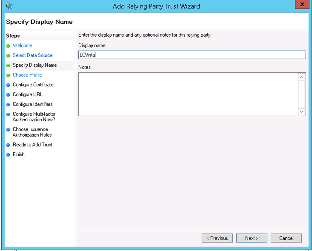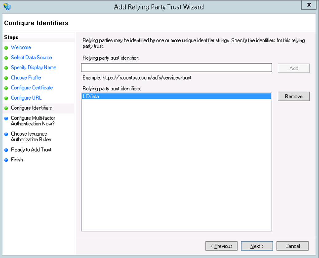 - Click Next. For the Relying party trust identifier, make sure this matches the IssuerID you specified in the SSO URL from the previous screen (we called it LCvista), then click Add.