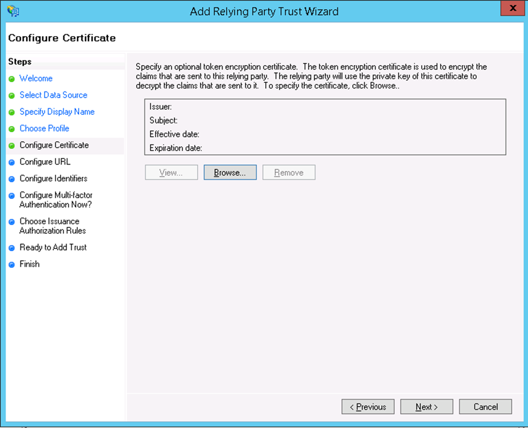 - Click Next, since we are going to use the Token-Signing Certificate from ADFS we won't need to upload a token encrypting certificate.
