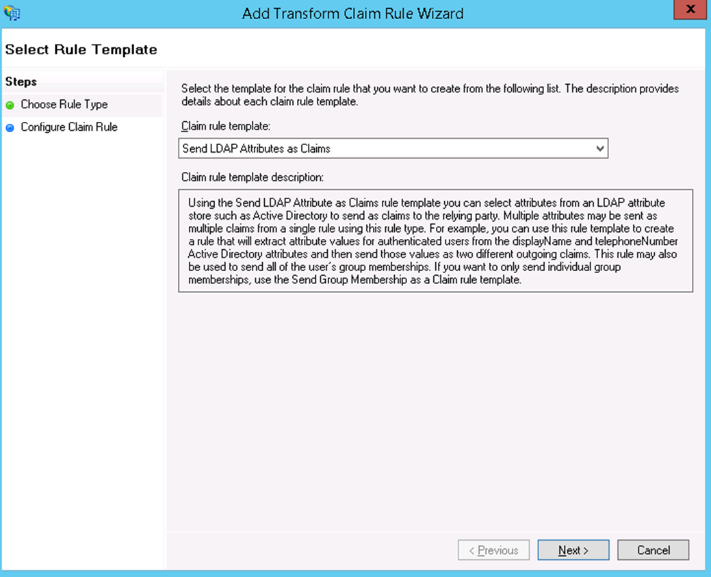 - Click Add Rule and make sure the Claim rule template has Send LDAP Attributes as Claims selected.