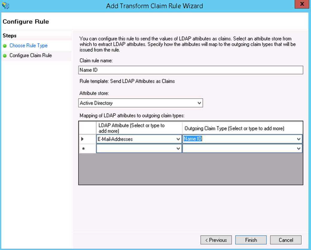 - Click Next. Give the Claim Rule a name, select the Attribute store to be our Active Directory. Then, for the LDAP Attribute select Email Addresses and for the Outgoing Claim Type select Name ID.