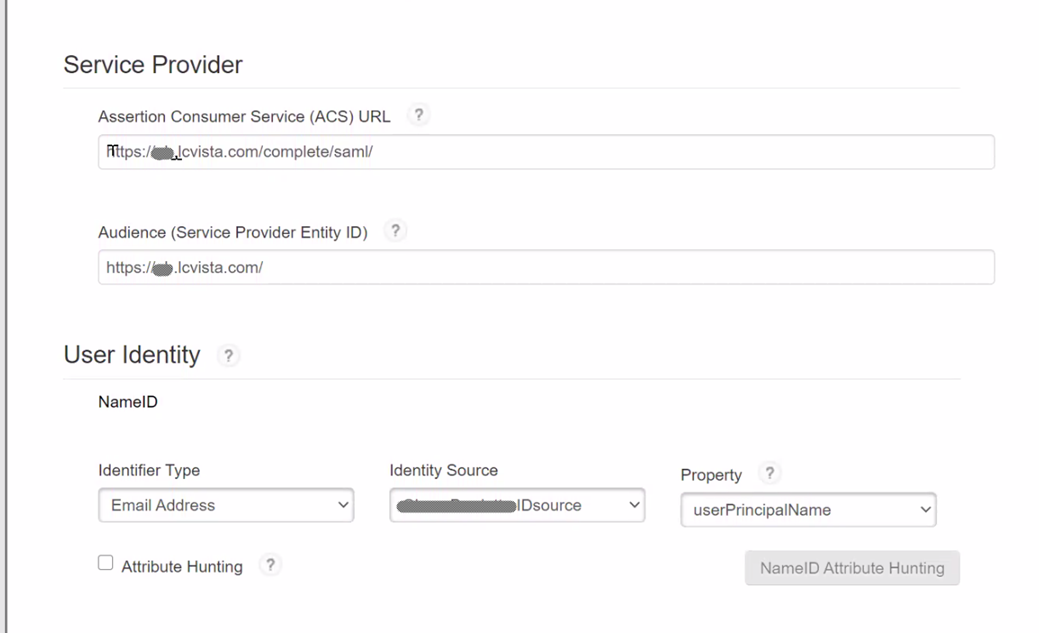 - User Identity: Ensure there is a defined property selected for the Identity Type, Source and Property. The default selections are acceptable as LCvista does not use the NameID in the SSO claims.