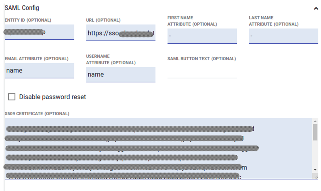 - x509 Certificate: Copy and paste the X509Certificate value from the metadata.xml file.