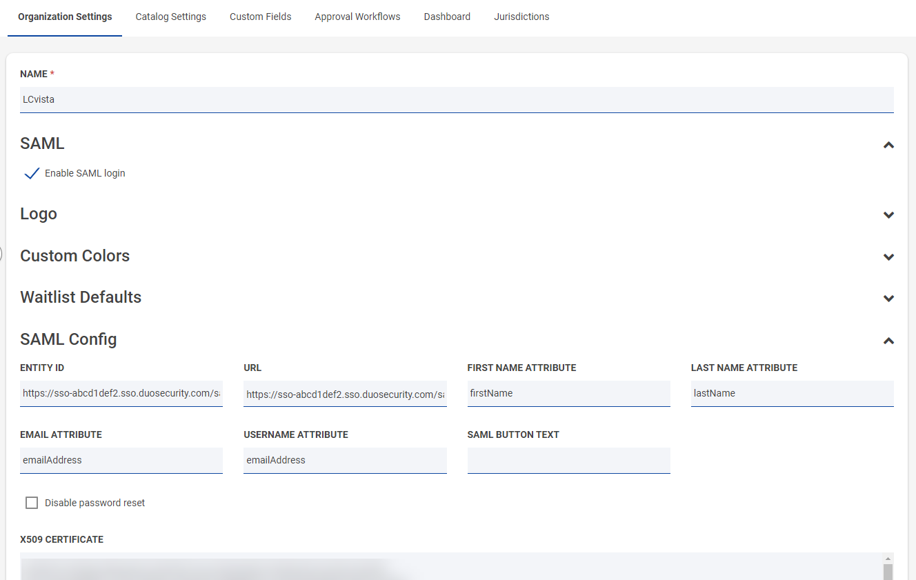 - Service Provider Login URL: https://<site prefix>.lcvista.com/complete/saml/