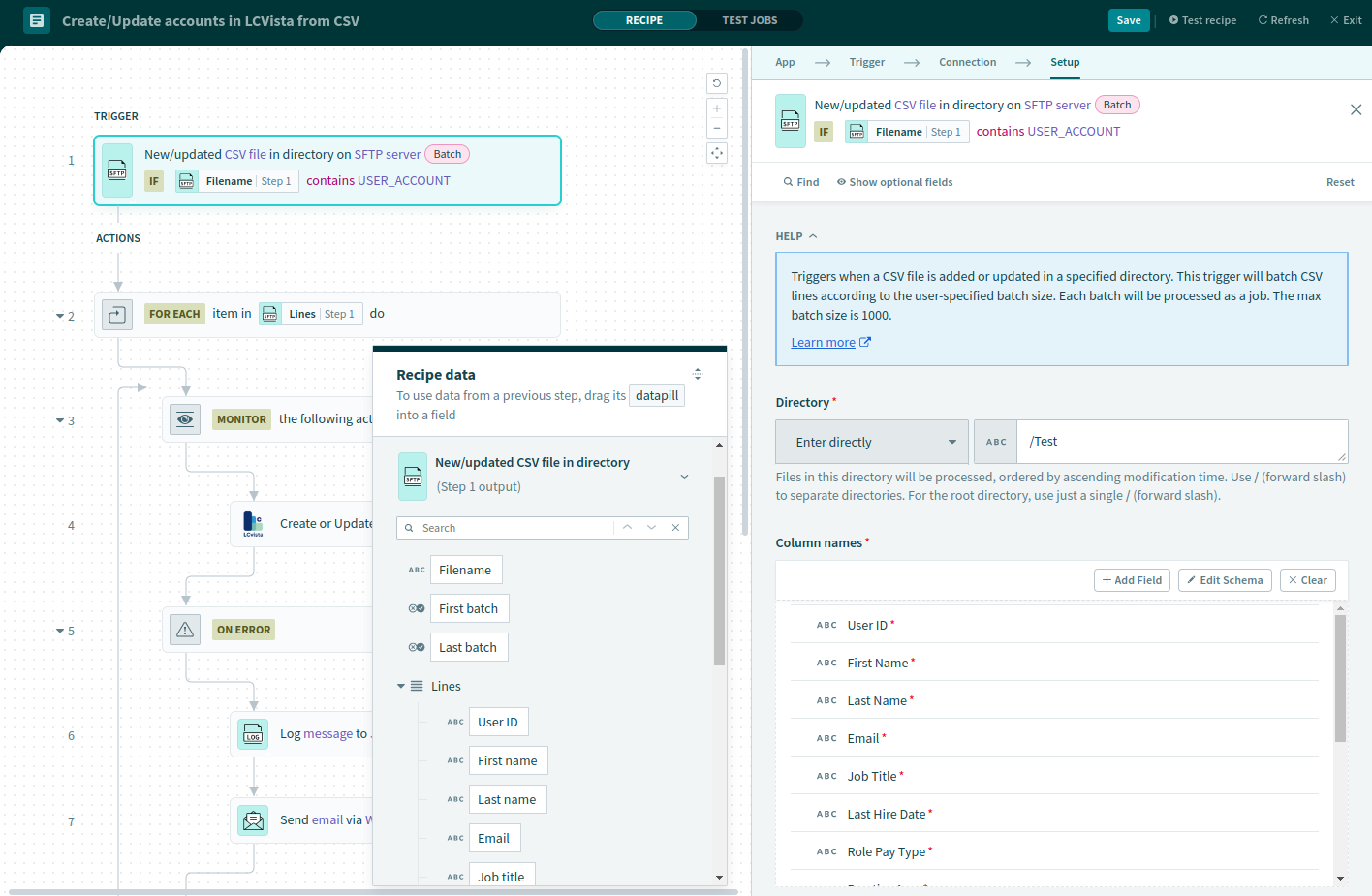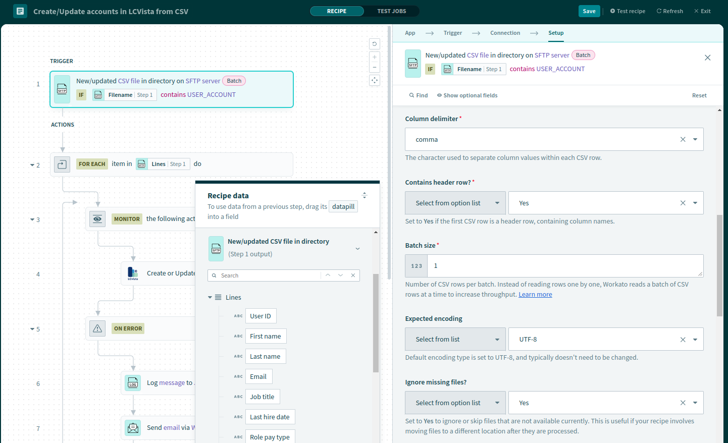 LCvista connections powered by Workato provide customers the ability to configure, define, and automate data connections in a self-serve manner. The default recipe provided by LCvista is configured to process a CSV file delivered through an SFTP connection. The recipe will look for a new file every 5 mins and process the data once a new file is uploaded to the SFTP site.
