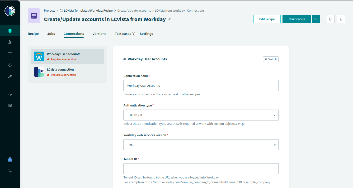 3. Click on the Workday connection and enter the required fields.