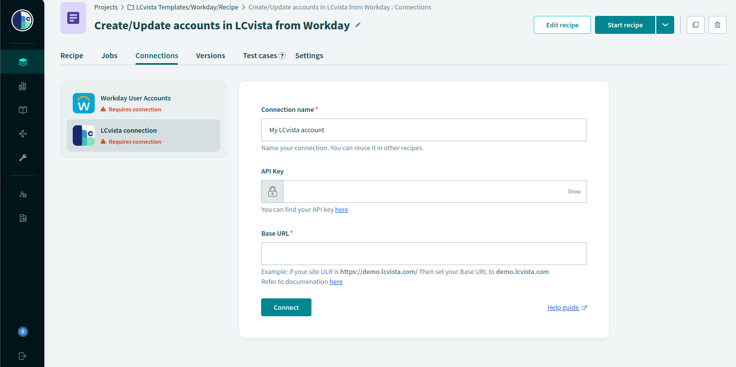 LCvista connections powered by Workato provide customers the ability to configure, define, and automate data connections in a self-serve manner. The default recipe provided by LCvista is configured to use the Workato "New/updated worker trigger", which will check for new or updated employee data approximately every hour. More details on the connector are available on Workato's support library.