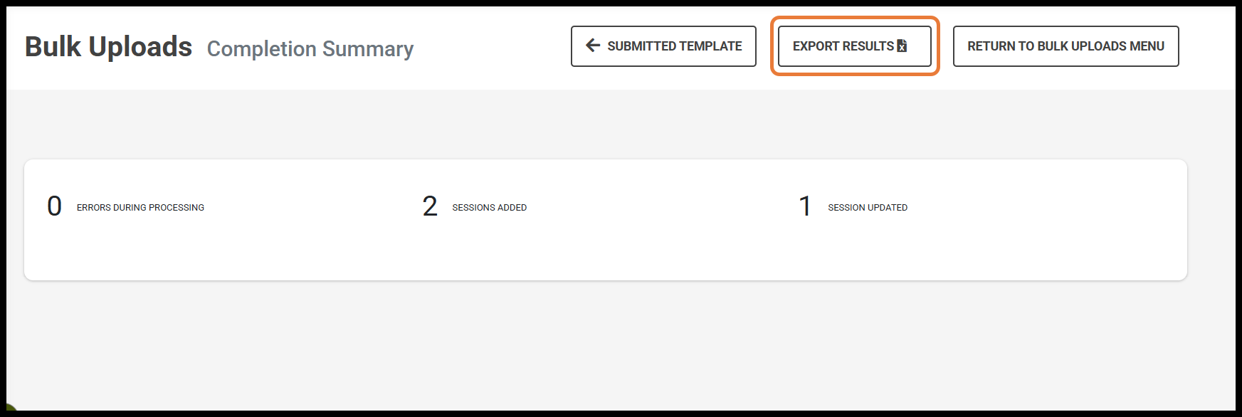 For Program and Session uploads, an Export Results button is available on the Summary view page. This allows you to download a file showing the processed results, including any errors. Other upload types do not provide this export option.