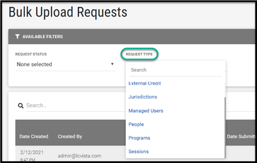 This menu offers the ability to filter by Request Type. This dropdown will expose all available bulk upload workflows.