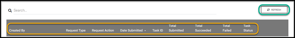 - Task Status. This column indicates the status of the request, whether it has finished processing (complete) or is pending (in progress).