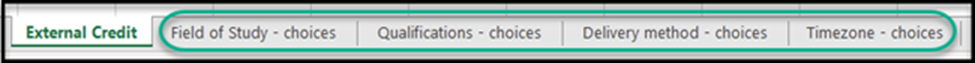 The Excel will be formatted to account for all information relevant to creating an external credit program. As you populate this template, take note of the following tabs embedded within the Excel file: