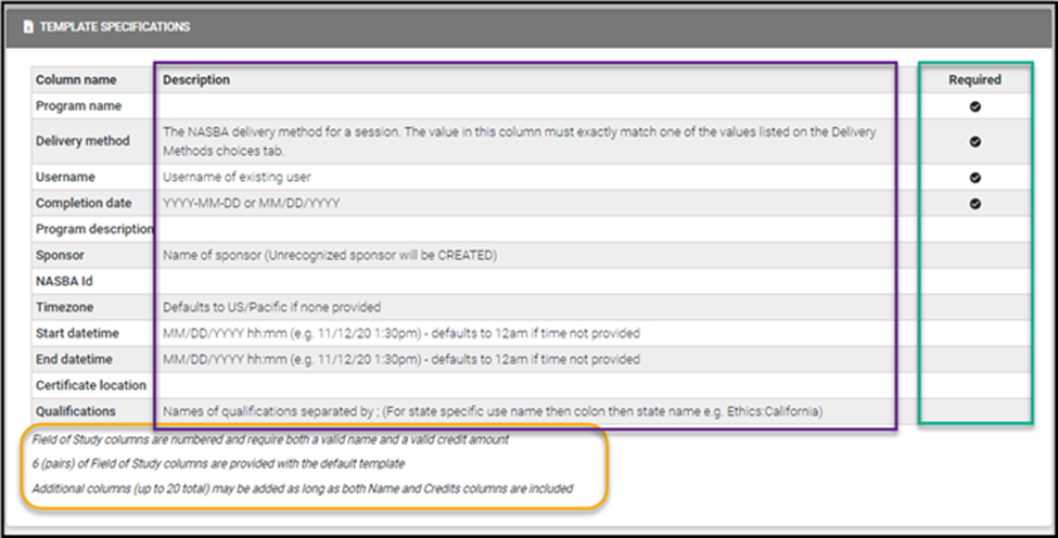 The Template Specifications table, visible on the second half of this page, is also important to review. This table confirms the types of updates that can be made, the column descriptions, and whether the columns are required for the respective updates.