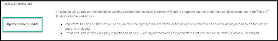 This specific upload type will allow you to Update Earned Credits only. Specifically, you can only update credits earned per jurisdiction on an existing session record where the user has already passed.