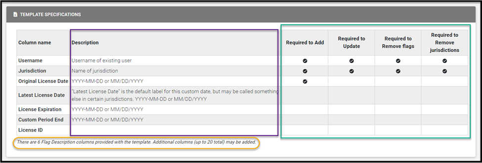 - Remove flags: use this action when flags need to be removed from a jurisdiction(s) for a professional. This action will only remove flags; thus, only the required columns for username, jurisdiction, and flag descriptions are required and should be added to the template. To remove all flags for a jurisdiction, you will only be required to note: remove all flags.