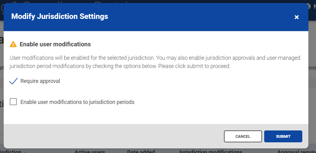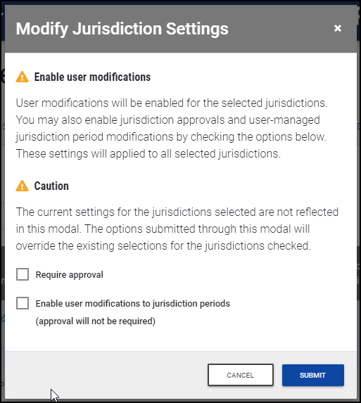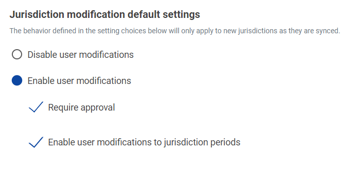 When a single jurisdiction has been selected, and when the action to enable user modifications has been chosen, this modal will reference the current settings for the jurisdiction.