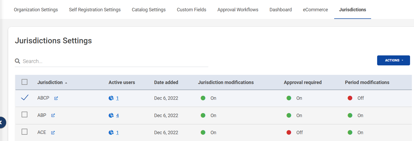 To further modify the settings on a jurisdiction-by-jurisdiction basis, navigate to the Jurisdiction Settings tab. Use the selection on the left-hand side of the table to specify a jurisdiction, or group of jurisdictions. Select the Actions menu to expose options to either disable or enable user modifications.
