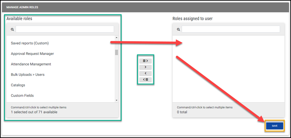 In order to assign custom roles to a professional, select all of the applicable roles that will be assigned to this user. Once these roles have been selected, you must select Save in order to continue.