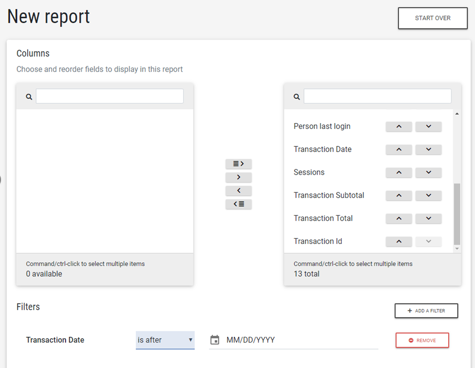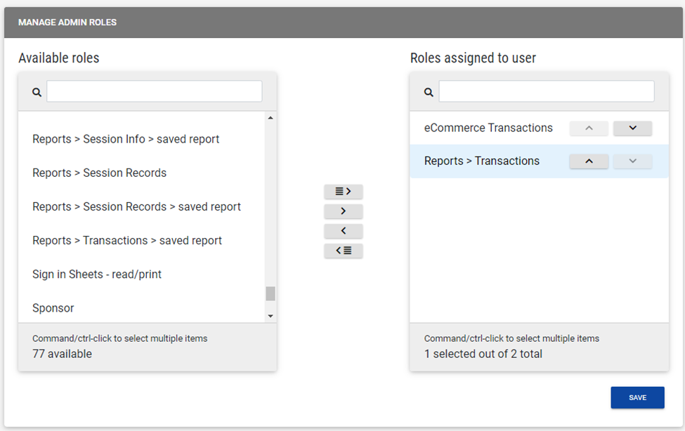 Note: The Default Admin, Reports > Transactions, or Reports > Transactions > saved report permission must be assigned in order to gain access to the Transactions Report.