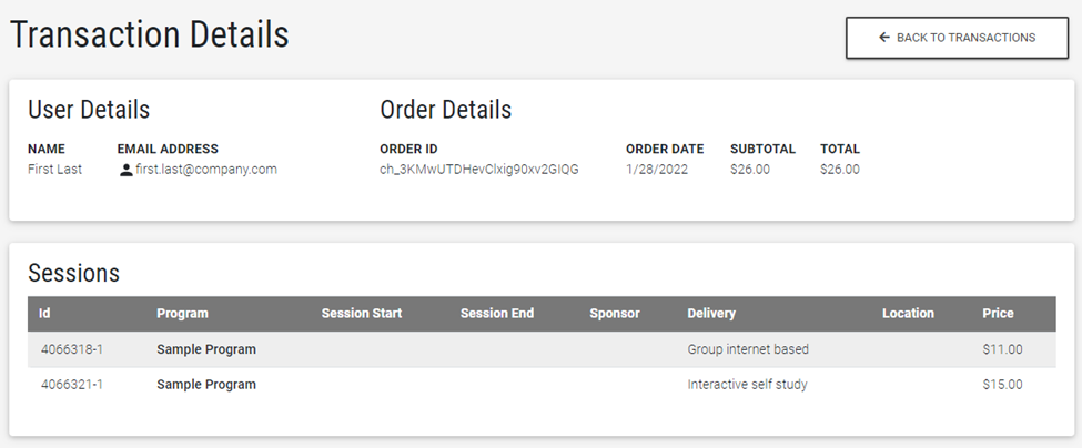 The Transaction Details page outlines additional details for the user, the transaction, and the session(s) purchased.