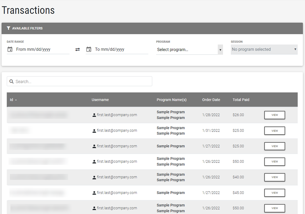 The Transactions table can be filtered by Date Range or by selecting a specific Program and Session.