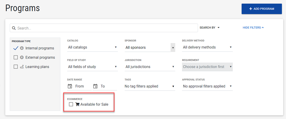 When eCommerce is enabled, the Manage Programs page will display a new program type filter: Available for Sale.