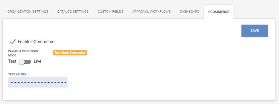 On the eCommerce tab in Settings, toggle to Test Mode to enter the Test API Key provided by Stripe and select Save. If the Test API key is valid, a status message will indicate that test mode is active.