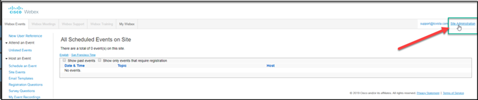 - Once logged in to your Webex account, click the Site Administration link.