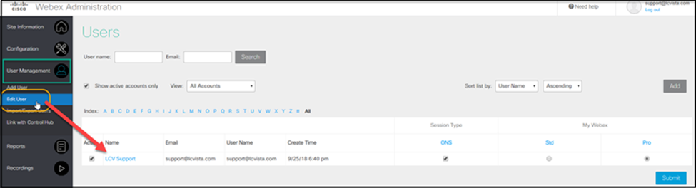 - Once you have clicked this link, click the “User Management” hub to expand this list. Once expanded, click on Edit User. Locate the users that are administrators in your system (the accounts that will be creating the WebEx meetings).