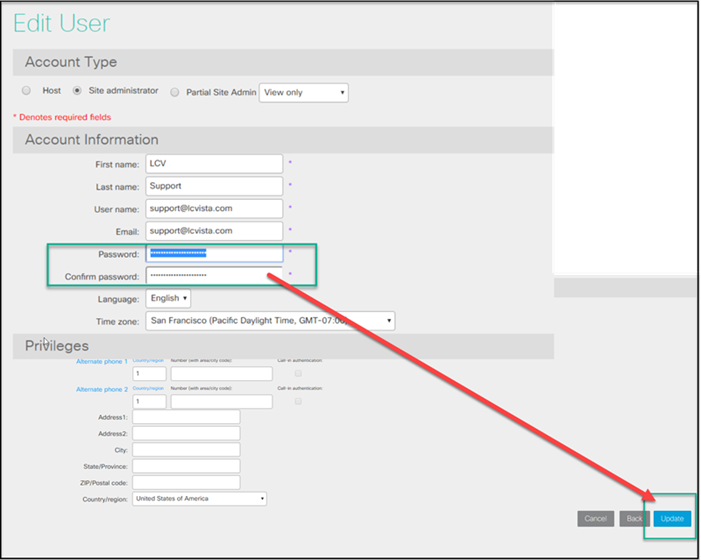 - Click on the name of the account and navigate to the password information. Please fill out a new password (that you will use in LCvista) for these account(s) and click Update when finished.