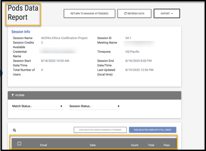Selecting this report will navigate you to the Pods Data report, where you can review the attendance details of each participant. Similar to the Webcast Completion report, you will have access from this page to review the polling responses returned and pass the appropriate individuals for credit.