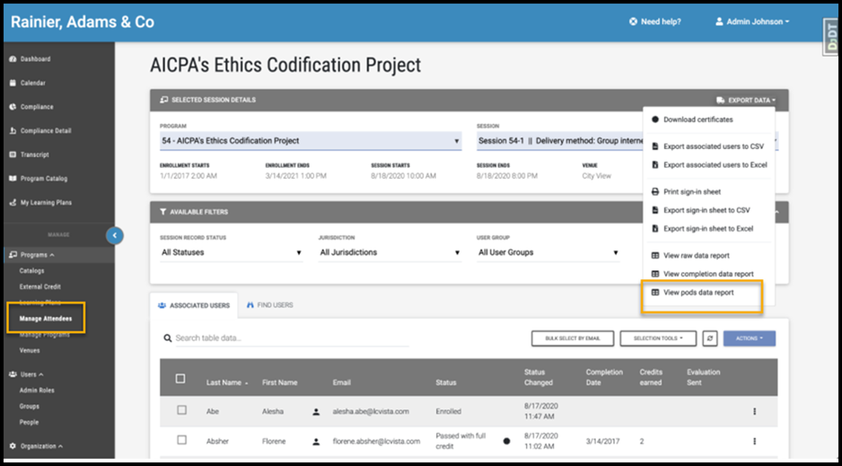 Once a webcast has taken place that has used the Pods integration, you may access this report through Manage Attendees. Search for your program and session ID. Those events that have webcast integration and Pods enabled will see the Pods report available from the Export Data drop down at the top right of this page.