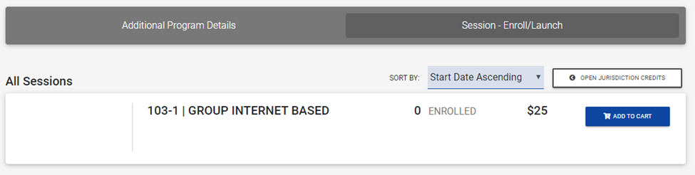 When a session is offered for sale, an Add to Cart button will replace the Enroll button. The session price will also be displayed to the left of the Add to Cart button where the Session Status would typically be displayed.