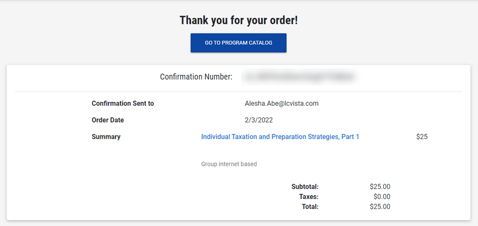 After completing the checkout process, you will automatically be redirected to LCvista’s confirmation page. The confirmation page will list the relevant details related to the transaction, including a unique transaction ID and details about the sessions purchased.