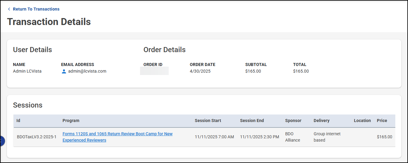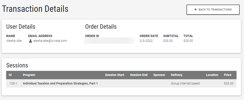 The Transaction detail page outlines additional details for the transaction and the session(s) purchased.