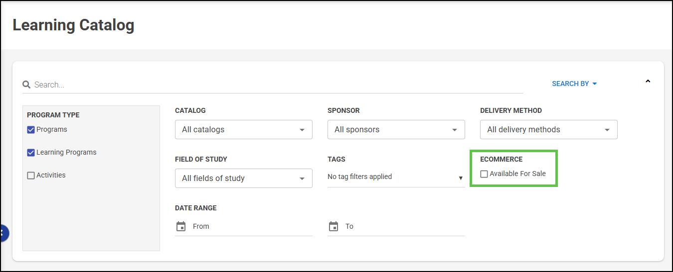 When eCommerce is enabled, the Learning Catalog will display a new program type filter: Available for Sale.