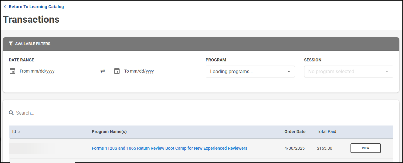 The Transactions table can by filtered by Date Range, or by selecting a specific Program and Session. Select View to open a detail view for the selected transaction.
