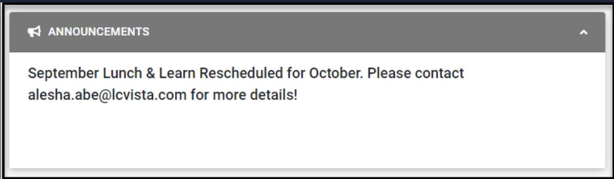 This is a customizable widget. Organizations will have full access to populate this widget with any information they wish, using our rich text editor. Organizations can use this widget to custom create messaging to highlight upcoming events, deadlines to be mindful of or any additional announcement relevant to the firm.