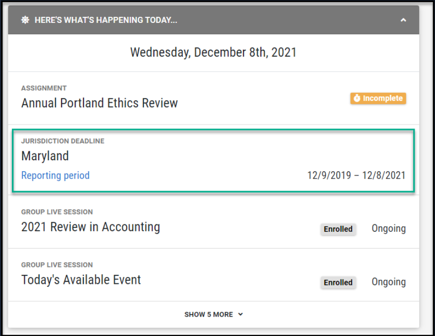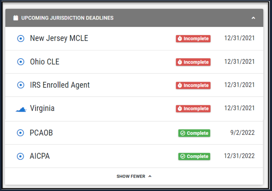 The purpose of this widget is to highlight to a user the next upcoming deadlines for their jurisdictions, and based on those deadlines whether they are complete for their requirements, or whether they are incomplete and have work to do.