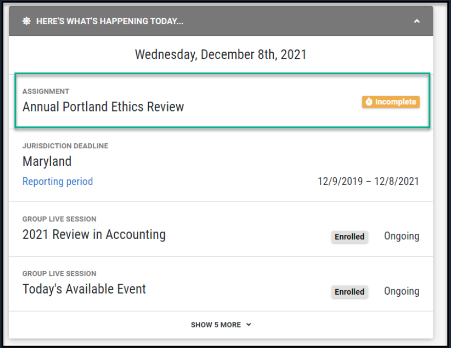 • incomplete activities will showcase their due date, if applicable, alongside an incomplete badge