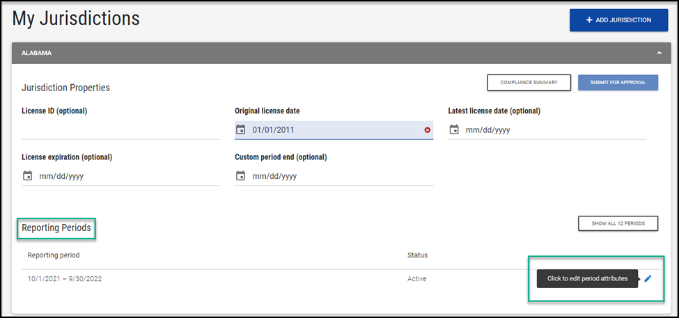 To modify a jurisdiction’s reporting period, select the edit icon next to the reporting period in question. Modify the data as needed and select Save to finalize your changes. If access to modify jurisdiction periods has been disabled, you will not have access to select this edit icon.