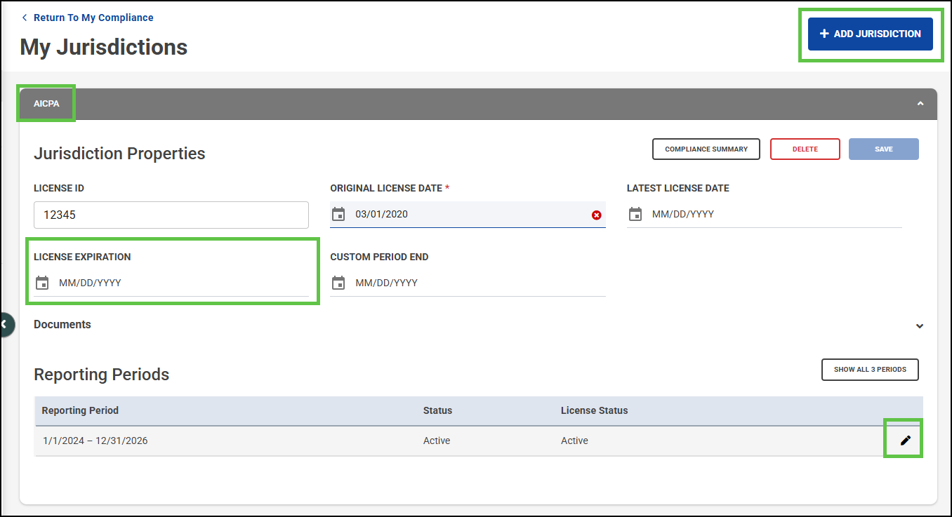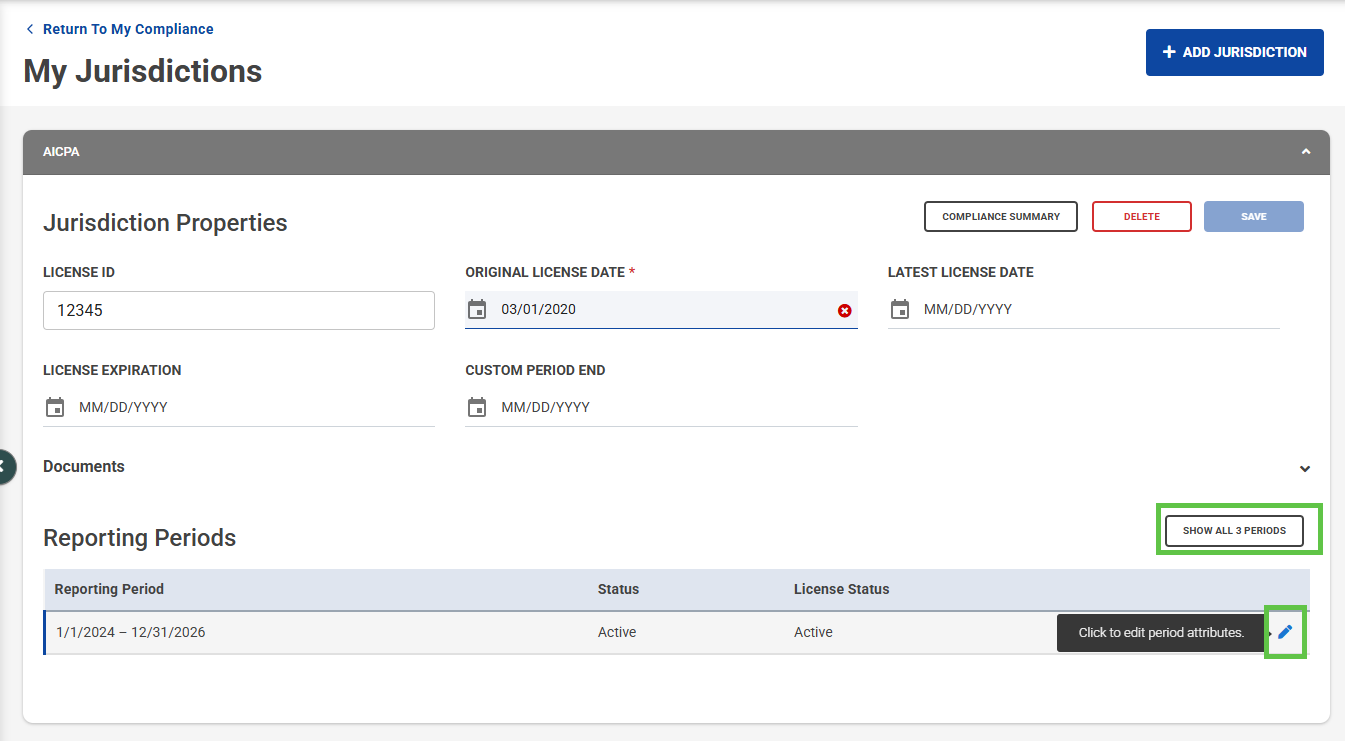 - Custom Period End Date: This is not a required field and should only be used if a change to your periods is required. Updating this field overrides the period dates automatically calculated by the inputted original license date. This should be used to make periods align with the information provided to you by your state board if it differs from the expected compliance period logic.