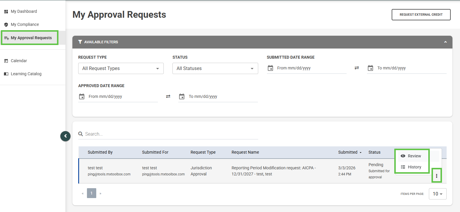 Within the My Approval Requests menu, you will have access to pending, approved, and denied requests. To access a pending request, select the Review option located within the row action menu of this table.