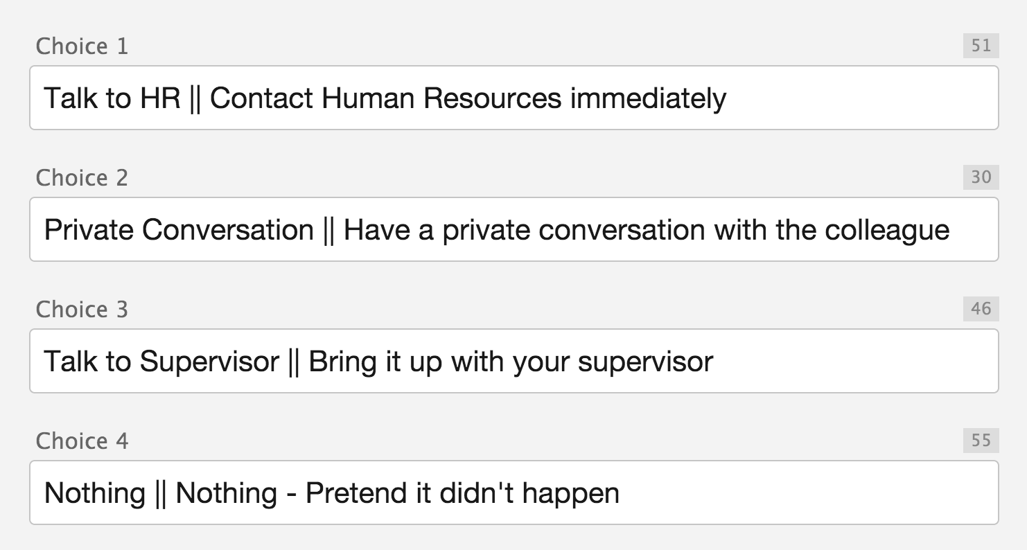 The long form of the poll choice appears when an attendee is selecting their response, and also in any spreadsheet data exporting. The short form of the poll choice appears in any result chart (both pie charts and bar charts), cleaning up its display.