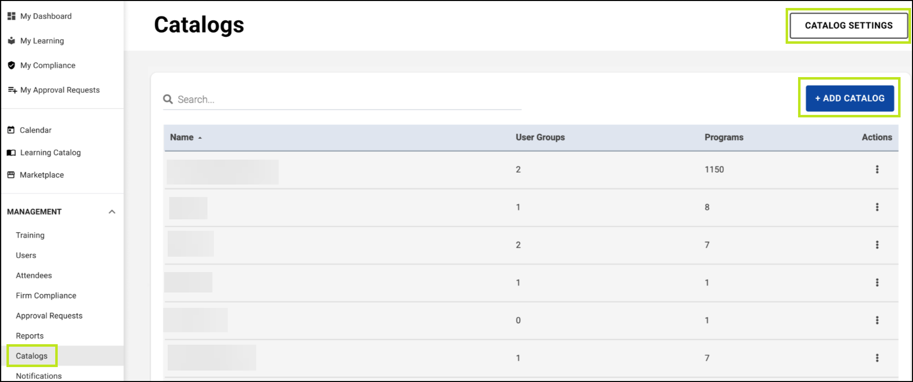 • Includes a Catalog Settings button in the top right, linking to the Catalog Settings page.