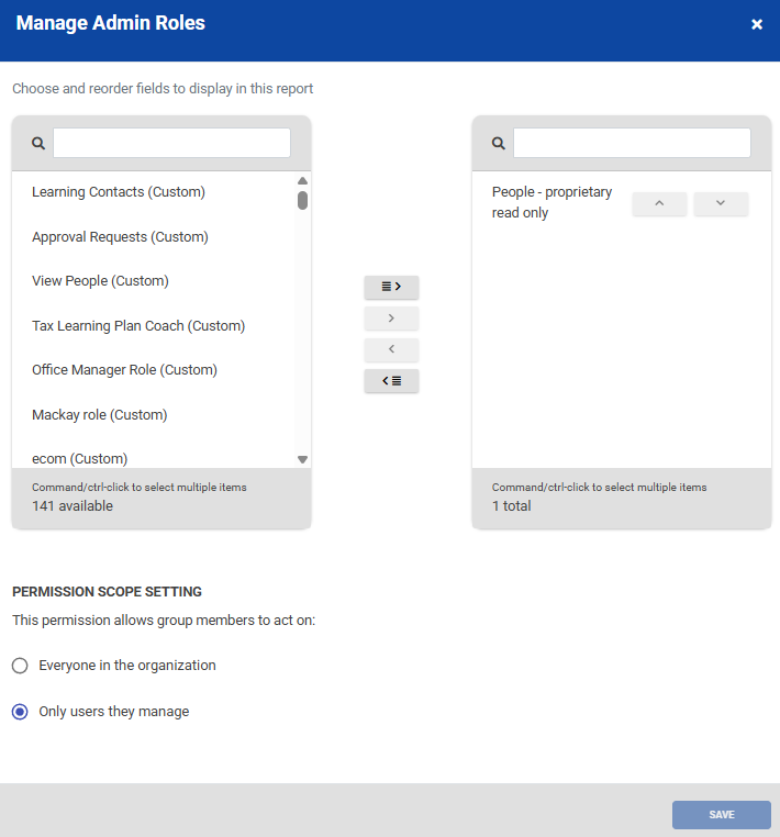 - Admin Roles: this tab will expose any permissions given to your group’s members. Select the Manage Admin Roles button to modify the permissions assigned to this group. When assigning permissions to a group, you can choose whether group recipients can see all users sitewide or if their exposure through that group permission should be limited to the users they manage. For more information on Custom Roles in LCvista, please visit our article here.
